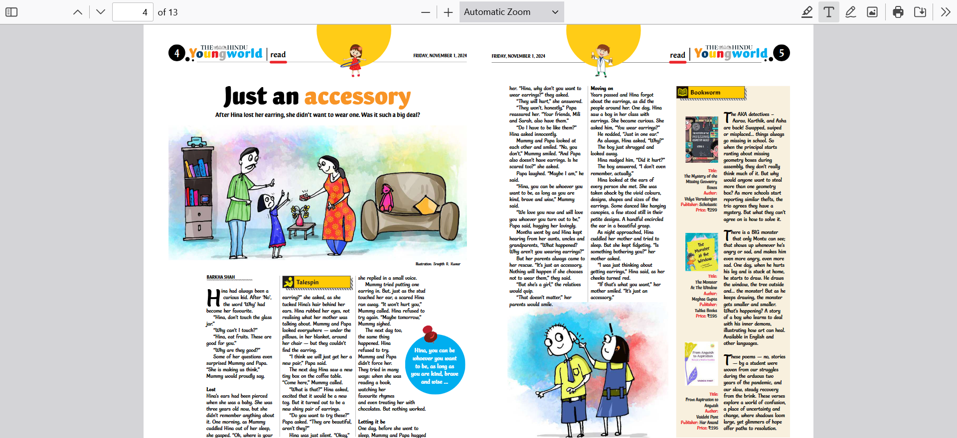 A short story for kids called 'Just an accessory' published in Young World, from The Hindu.